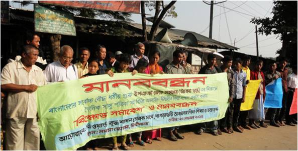 বান্দরবানের রাজগুরু শ্রীমৎ উপঞ্ ঞা জোত মহাথের (উচ হ্লা ভান্তের) বিরুদ্ধে সংবাদ প্রকাশের প্রতিবাদে বৃহস্পতিবার রাঙামাটিতে মানববন্ধন কর্মসূচি পালিত হয়েছে।