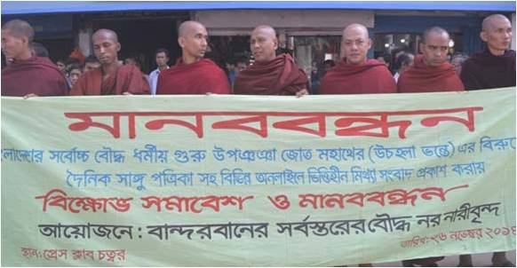 বান্দরবানের স্বর্ণ মন্দির প্রতিষ্ঠাতা ও রাজগুরু বৌদ্ধ মন্দিরে বিহারাধ্যক্ষ উচহ্লা ভান্তেকে জড়িয়ে সংবাদ প্রকাশে ও ধর্মীয় অনুভূতিতে আঘাত হানার অভিযোগে বুধবার সকালে বান্দরবানে মানবন্ধন কর্মসূচি পালিত হয়েছে।