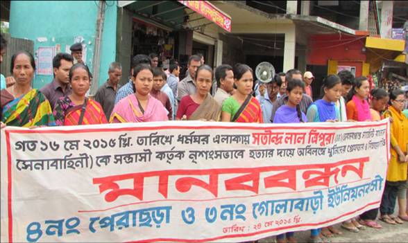 খাগড়াছড়ি জেলা সদরের ধর্মঘর এলাকায় সাবেক সেনা সার্জেন্ট সতীন্দ্র লাল ত্রিপুরার হত্যাকারীদের দৃষ্টান্তমূলক শাস্তির দাবীতে  রোববার মানববন্ধন কর্মসূচী পালন করেছে গোলাবাড়ী ও পেরাছড়া ইউনিয়নের বাসিন্দারা।