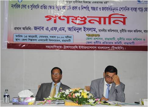 ট্রান্সপারেন্সি ইন্টারন্যাশনাল বাংলাদেশ(টিআইবি) সহায়তায় ও রাঙামাটি দুদকের আয়োজনে জেলা শিল্পকলা একাডেমী মিলনায়তনে অনুষ্ঠিত গণশুনানিতে প্রধান অতিথি ছিলেন দুদক কমিশনার এএফ আমিনুল ইসলাম। জেলা প্রশাসক মোহাম্মদ মানজারুল আলমের পরিচালনায় অন্যান্যর মধ্যে বক্তব্যে দেন দুদকের চট্টগ্রাম বিভাগীয় পরিচালক আক্তার, টিআইবি’র সিনিয়র প্রোগ্রাম মানেজার কাজী শফিকুর ইসলাম, জেলা দুর্নীতি দমন প্রতিরোধ কমিটির সভাপতি মায়াধন চাকমা, সচেতন নাগরিক কমিটির রাঙামাটির চাদ রায় প্রমুখ। অনুষ্ঠিত এ গণশুনানীতে সরকারী বিভিন্ন দপ্তরের কর্মকর্তারা উপস্থিত ছিলেন।