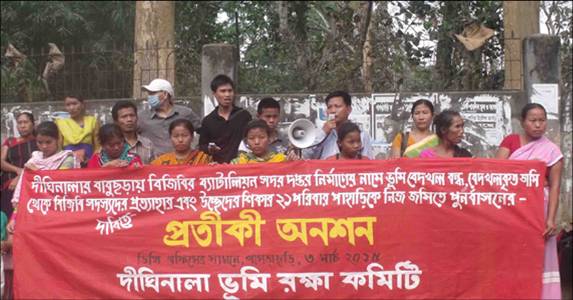 দীঘিনালার বাবুছড়া বিজিবি ব্যাটালিয়ন সদর দপ্তর নির্মাণের নামে ভূমি বেদখল বন্ধ, দখলকৃত ভূমি থেকে বিজিবি সদস্য প্রত্যাহার ও উচ্ছেদের স্বীকার ২১ পরিবারকে নিজ জমিতে পূণর্বাসনের দাবীতে মঙ্গলবার খাগড়াছড়িতে প্রতীকি অনশন করেছে দীঘিনালা ভূমি রক্ষা কমিটি।